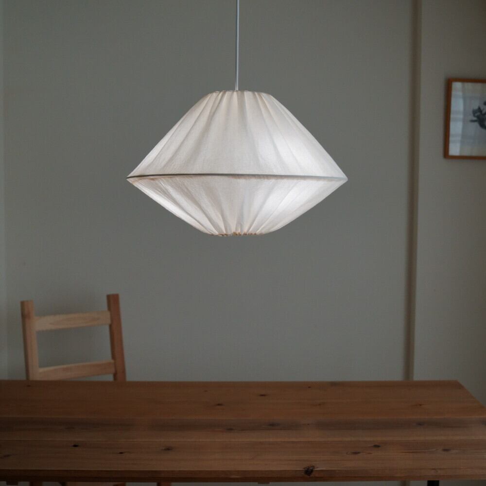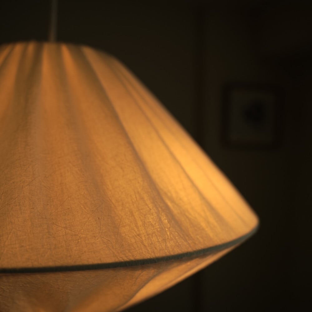 不均一にはいるギャザー部分が陰影をつくり、中にひかりが詰まっていることを想像させます。そんなシェードいっぱいのひかりが、上下の穴から少しずつさらさらとこぼれてくるような、そんな照明です。E26の電球を3灯入れられるため、暗めから明るめまで電球の選びしろが広く、お好みに合わせて対応出来ます。